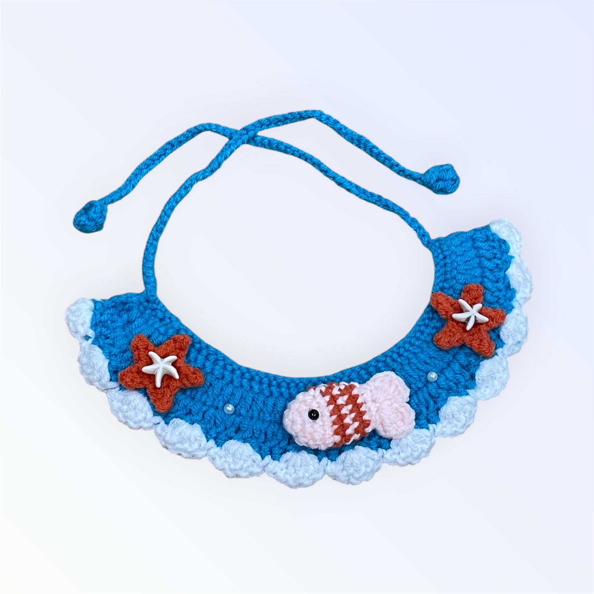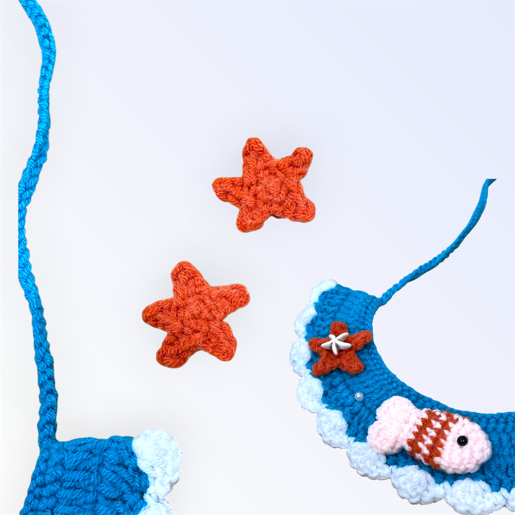 Dùng keo nến hoặc chỉ khâu 2 sao biển và cá vào yếm. Trang trí thêm charm theo sự sáng tạo của bạn, có thể móc thêm phần bảng tên để treo vào cho boss nhé! Chúc các bạn thành công.